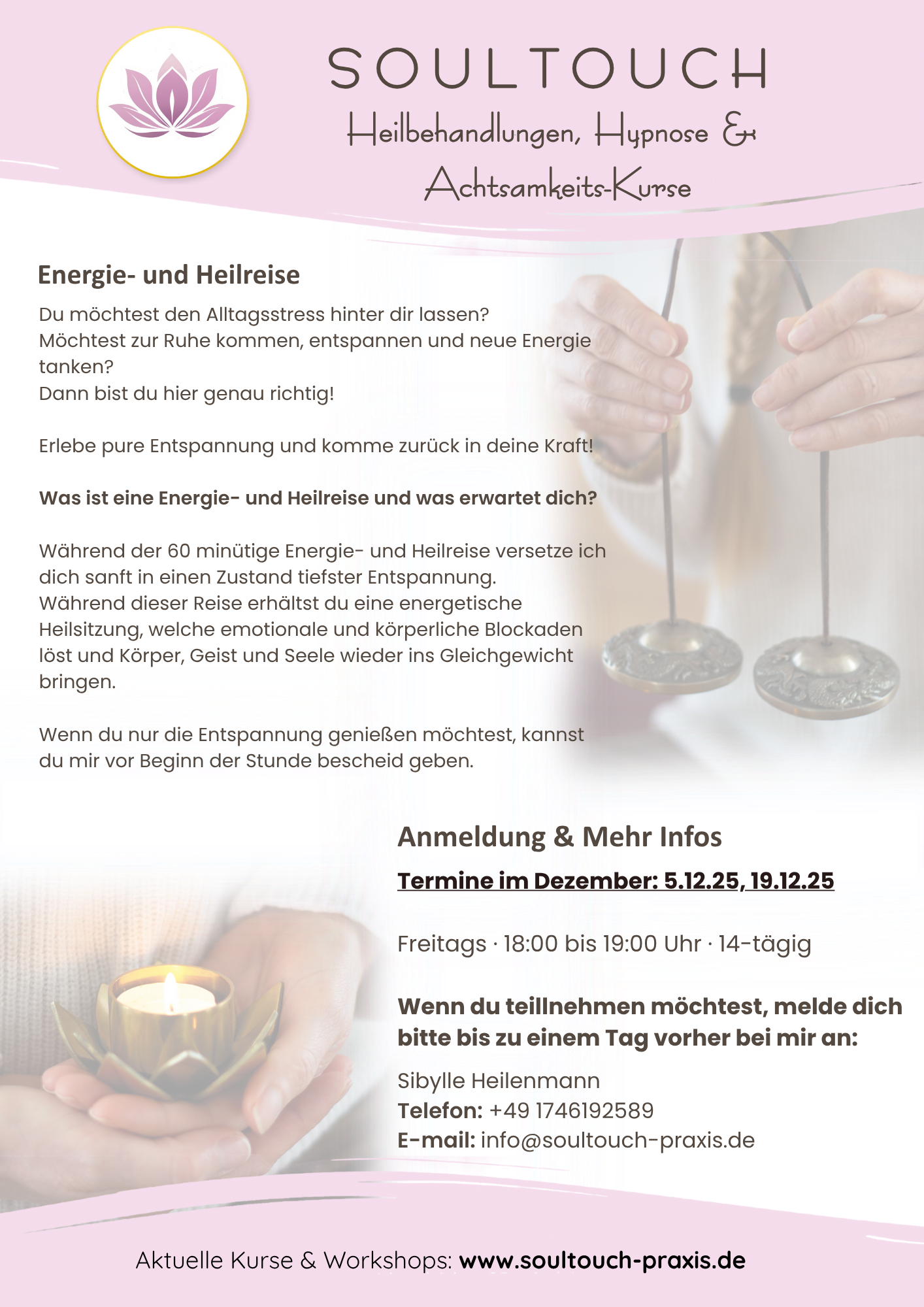 Am Freitag, dem 19.12. erwartet dich 14-tägig eine geführte Heilreise zum Entspannen!
