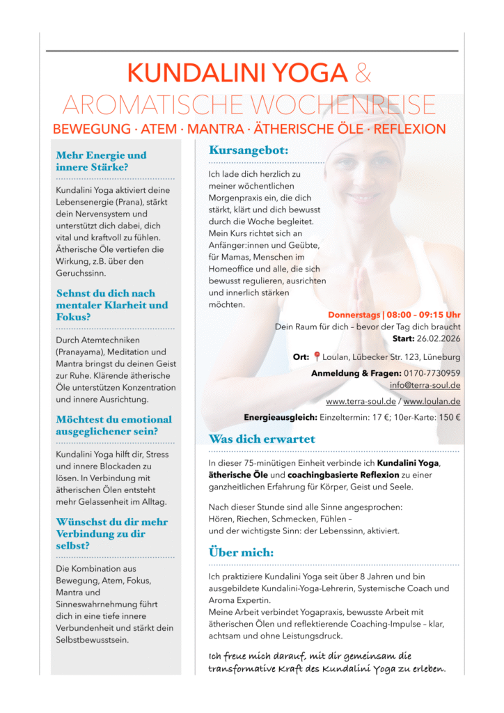 In dieser 75-minütigen Einheit verbinde ich Kundalini Yoga, ätherische Öle und coachingbasierte Reflexion zu einer ganzheitlichen Erfahrung für Körper, Geist und Seele.