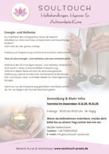 Ich arbeite mit energetischen Heilmethoden, bin in Hypnosetherapie ausgebildet und befinde mich derzeit in der Ausbildung zur Achtsamkeitslehrerin. In meine Arbeit fließen sowohl traditionelle Methoden als auch moderne Erkenntnisse aus der Persönlichkeitsentwicklung ein.